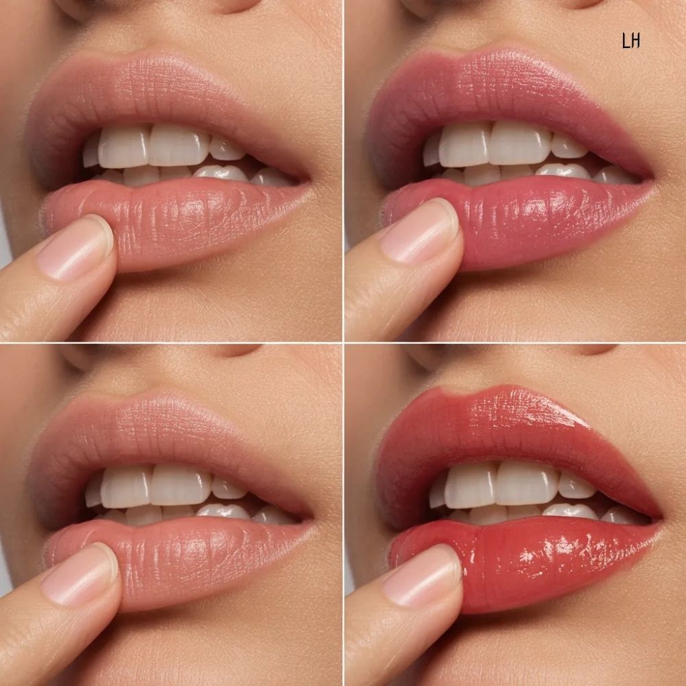 This subtle brightness catches light and creates a natural plumping illusion without looking obvious. The final effect feels soft and effortless, almost like your lips naturally have that shape.